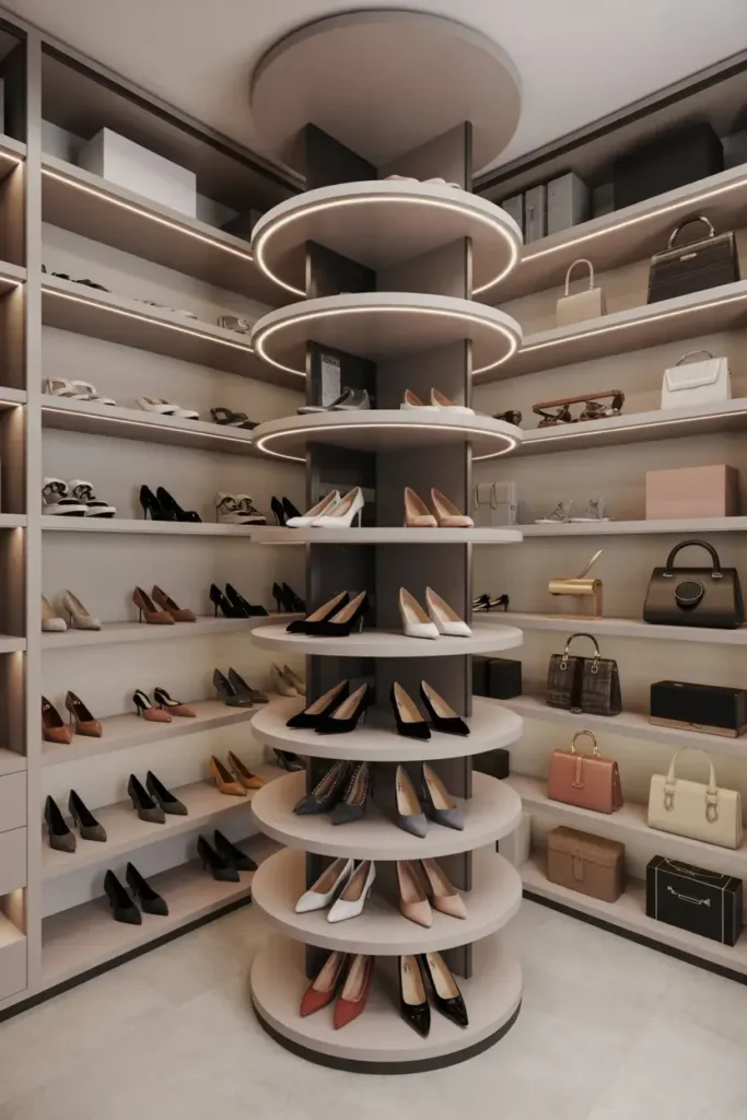 I find that a 360-degree rotating shelving unit is a total game-changer for shoe storage. You can fit dozens of pairs of shoes or handbags into a relatively small footprint.
