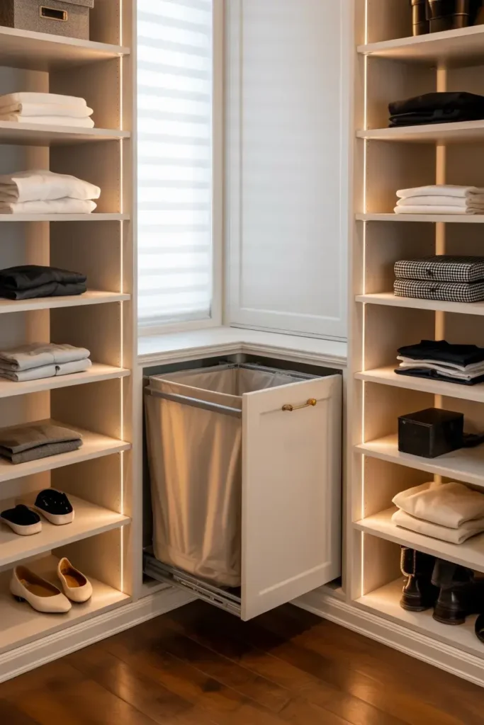 You can utilize the depth of the corner to house bulky laundry bags without encroaching on your walkway. This keeps your dirty clothes organized and your floor completely clear of clutter.