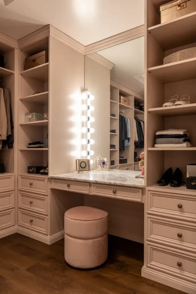 You can tuck a small stool underneath, so it doesn’t block the walkway. This adds a touch of luxury and turns your closet into a true dressing room retreat.